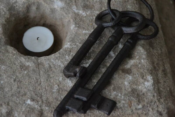 Decoratieve sleutelbos in gietijzer met 3 nostalgische sleutels aan een ring.