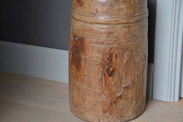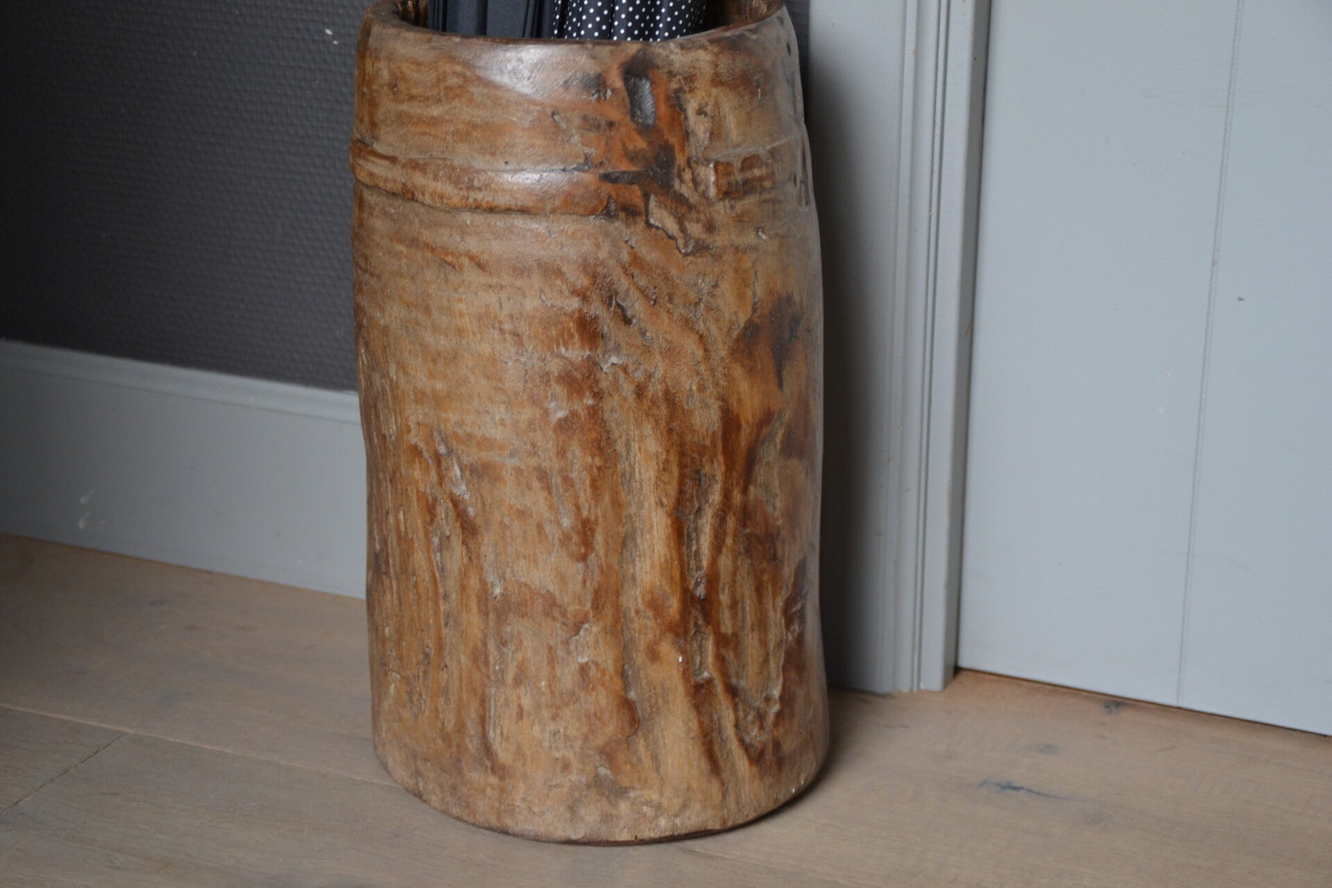 Unieke oude hoge houten vijzel, te gebruiken als paraplubak maar kan ook gewoon ter decoratie...Afmetingen:hoogte ca. cmdoorsnee ca. cmdoorsnee binnenmaat ca. cm