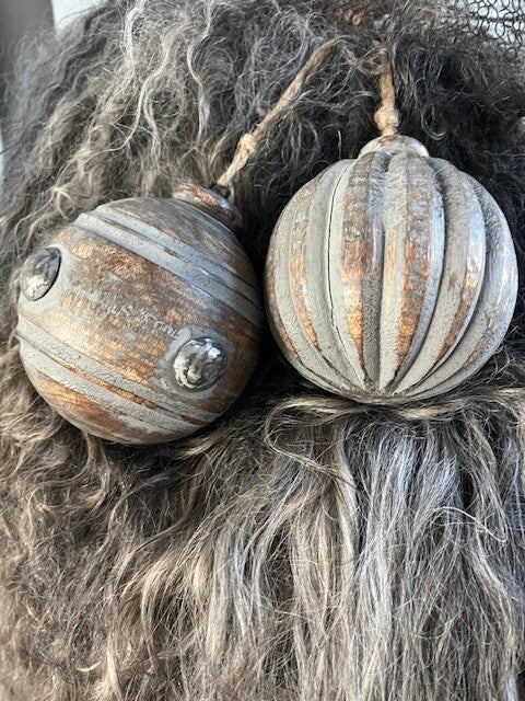 Stoere massief, oude houten ballen, perfect om te decoreren in een schaal, aan een luik, noem maar op. De kleur is naturel hout en grijs