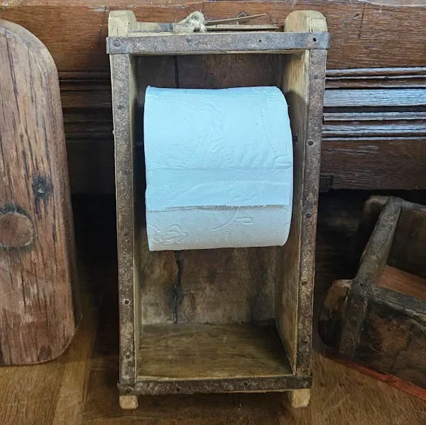 Oude houten mal baksteenmal omgebouwd tot toiletrolhouder / WC rolhouder industrieel vintage landelijk doorleefd oud houten toiletpapierhouder landelijk stoer hout.