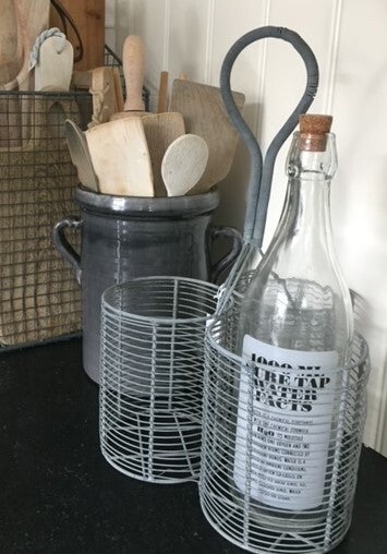 Prachtig deze draad flessenhouder in zink metaal, heel gemakkelijk voor wijnflessen en water in 1 keer naar tafel te dragen en ook nog eens decoratief.