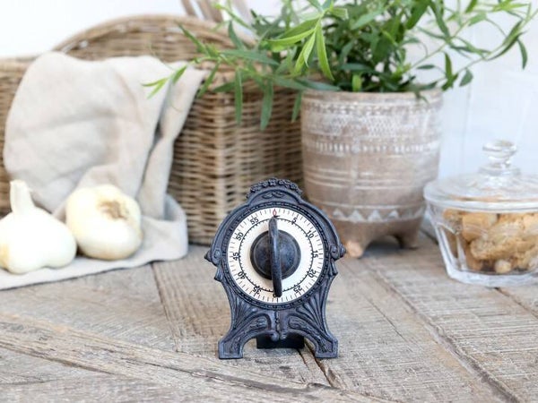 Prachtig deze brocante kookwekker in gietijzer antique grey