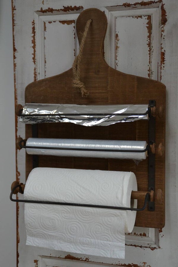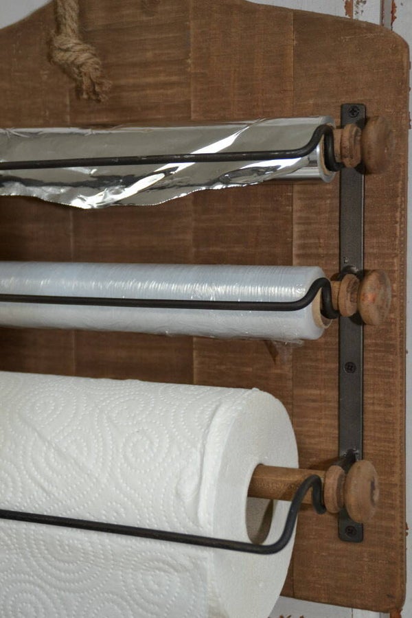 Frans landelijke houder voor aan de muur in de vorm van een snijplank met 3 houten stokken voor de keukenrol, rol aluminium en folie.
